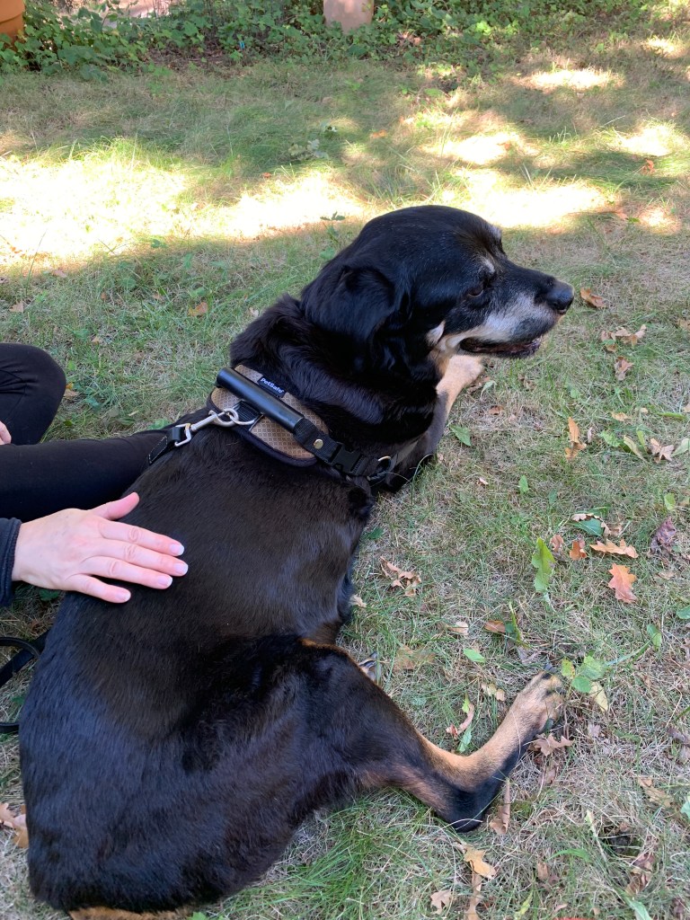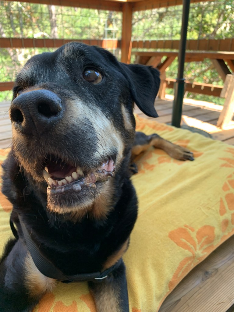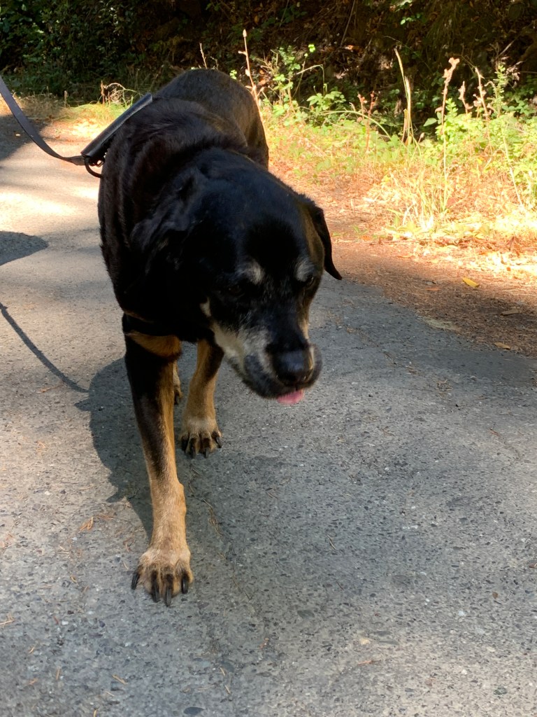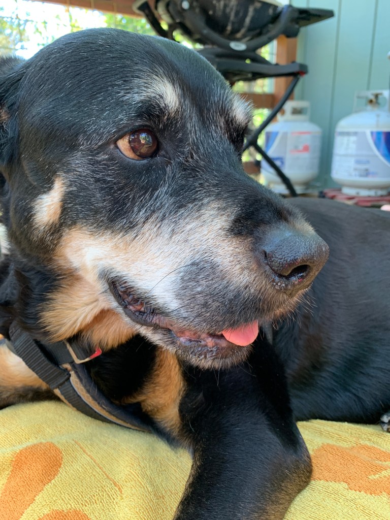 Our appointment today is at 3pm. We have a spot on our deck that she loved to sit at and so we moved the umbrella out there. If it’s too hot there, we will move to our lawn in the front of the house. It’s 12:30 right now and we gave sammi her last meal. Ground beef, chicken livers and a raw egg. One thing that she hasn’t lost is her appetite. Now, she’s even more hungry due to the internal bleeding that is leaving her anemic. I think that her meal was the human equivalent of a nice filet with all the fixings. Earlier today she was up for a walk so Ro put her on her leash and we walked a short distance down Austin Creek Road. It is a cool day today and it was a peaceful walk. Sammi wanted to walk farther so we walked just a few more steps, then turned around back home. When we got back we sat out on the lawn. She sniffed the grass, pooped, and then came to sit by us again.