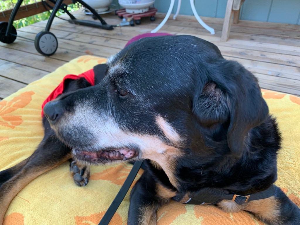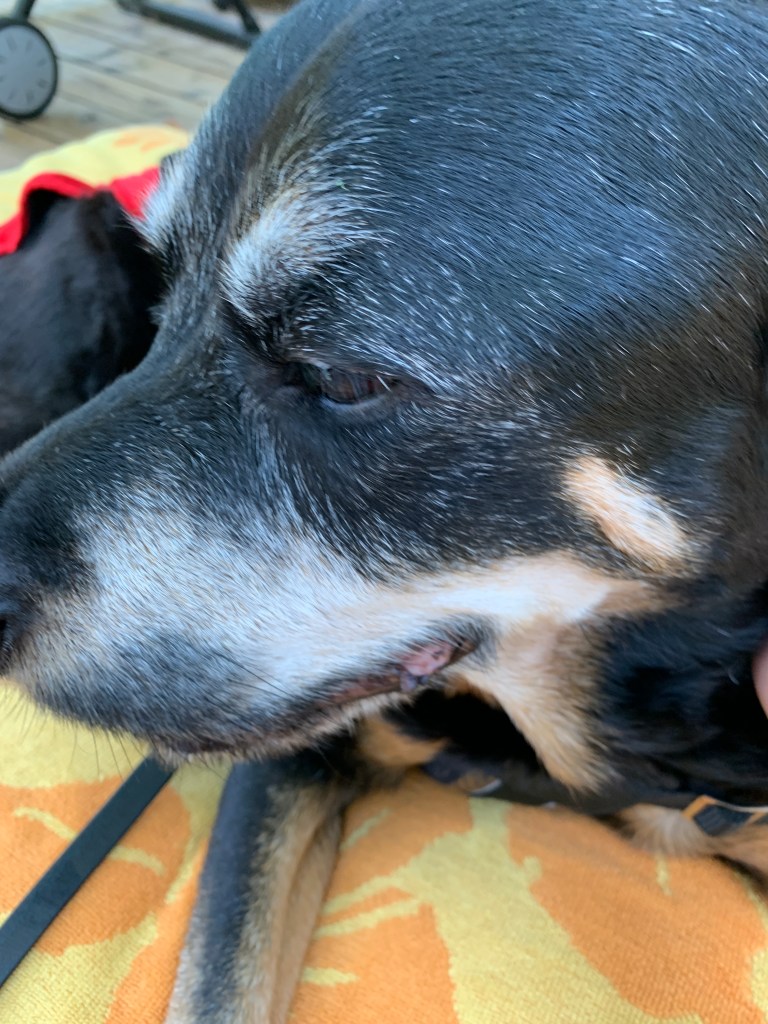 It is now 3:26. Sammi is gone. We spent the last few moments on our deck. We put the umbrella up and put her bed out. She came to join us on the deck and we layed next to her, half on and half off her small bed, Ro and I flanking her. We pet her and praised her for being such a good dog. I wanted one more time to share a slice of apple but she didn’t want it. I think she was full from the liver and ground beef and previous apple bites. The vet and her husband both came. They knocked on the door to let us know that they were here and then went down to prepare the two injections. They were very kind, compassionate. They explained what was going to happen. One shot put her to sleep, the next allowed her to pass. Ro had told me that this was going to happen but it was ok for them to relay the information.